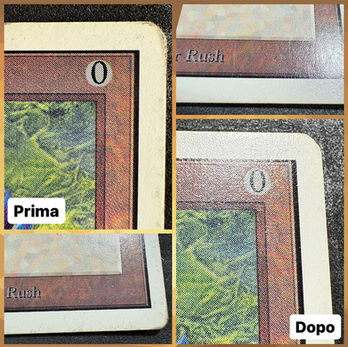 Il servizio di Cleaning si compone essenzialmente di una pulizia totale della carta, comprendendo sia il front che il back. La carta viene lavorata al fine di eliminare per quanto possibile tutti gli agenti superficiali che hanno intaccato la stessa, tra i quali possiamo trovare: punti neri di sporco, aloni bianchi, macchie, scritte inked (dipende dall'inchiostro utilizzato), micro-graffi sulla parte olografica.